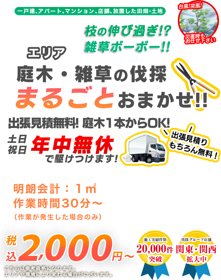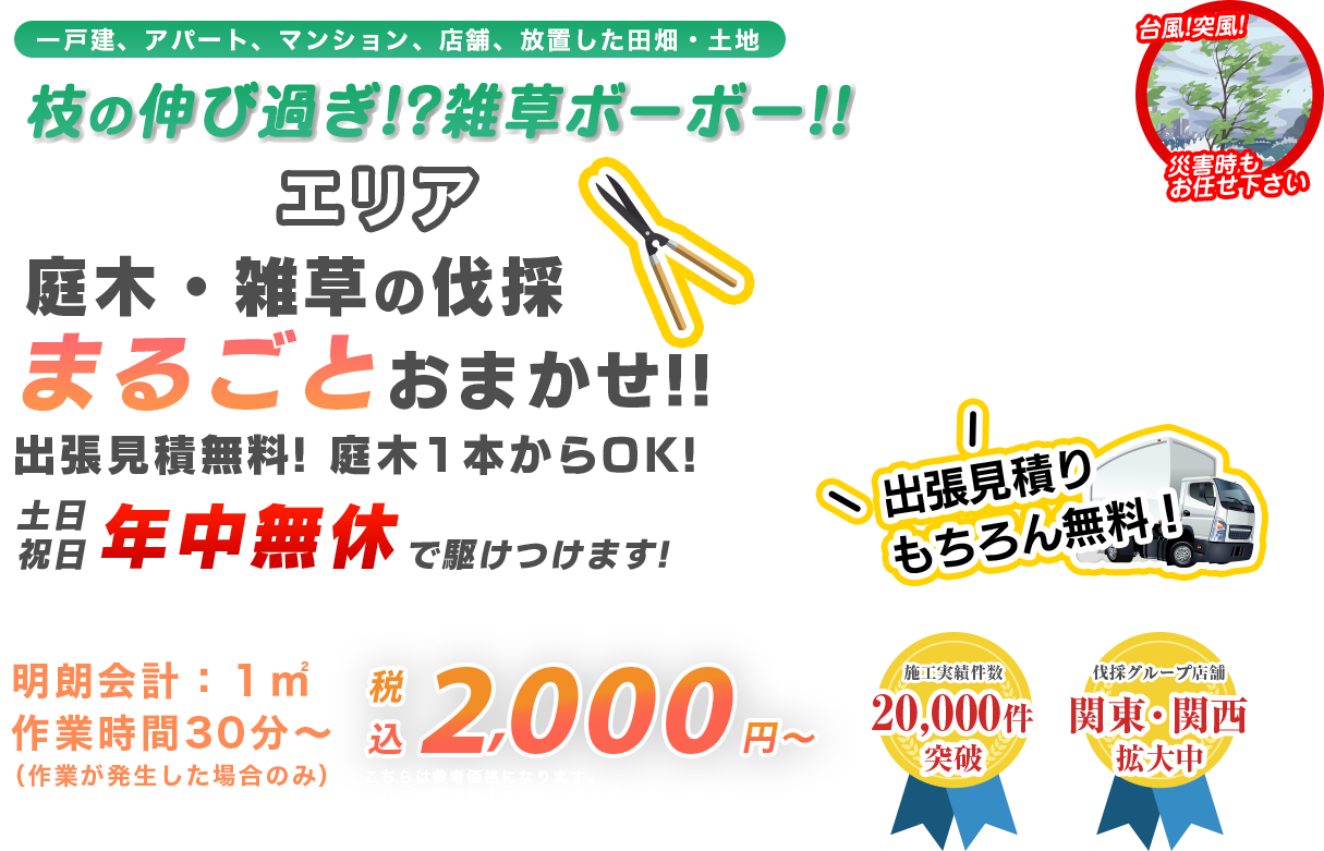 | A | 基本的にはかかりません。埼玉県であれば、出張費はいただいておりません。 ※ 上記以外の遠方の場合は、別途出張費がかかります。 ※ 最低料金総額3,000円~となります。 ※ 伺った際、作業が困難な場合(ツタが絡んでいる、足場が狭い、等)は、別途料金がかかる場合もあります。 |