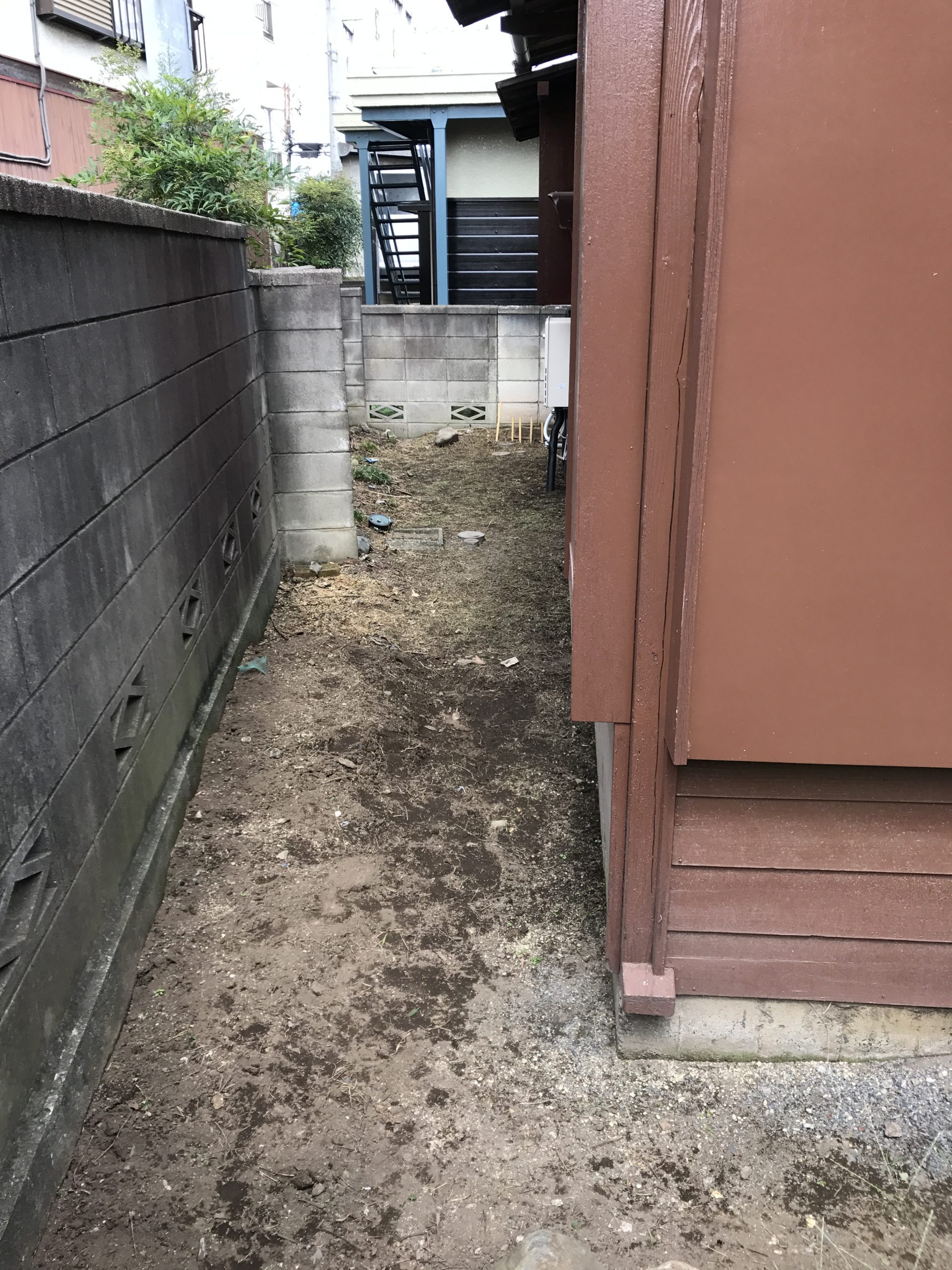 お庭の壁の際に植えていた植木を伐根いたしました。