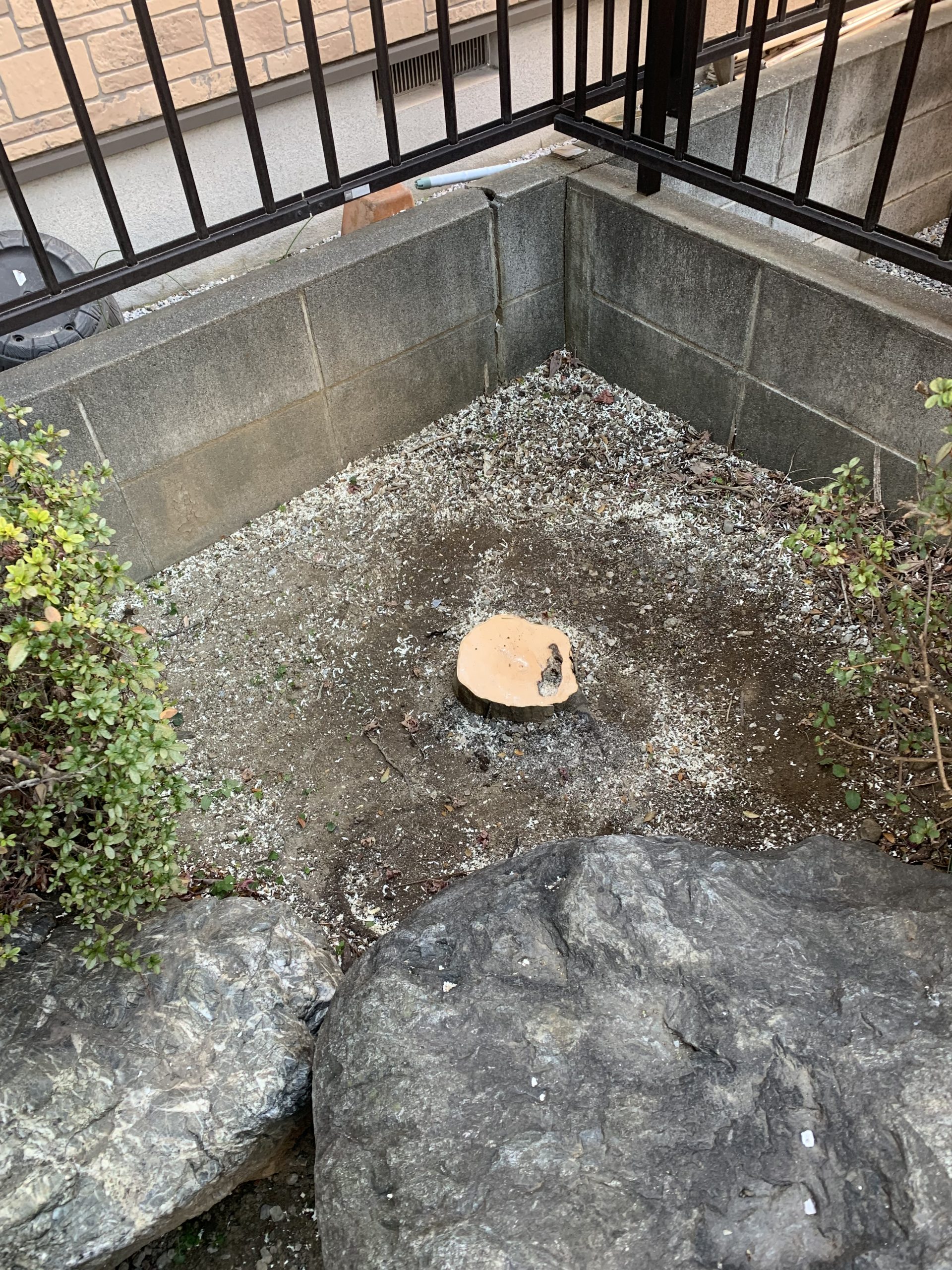 お庭の壁の際に植えていた植木を伐根いたしました。