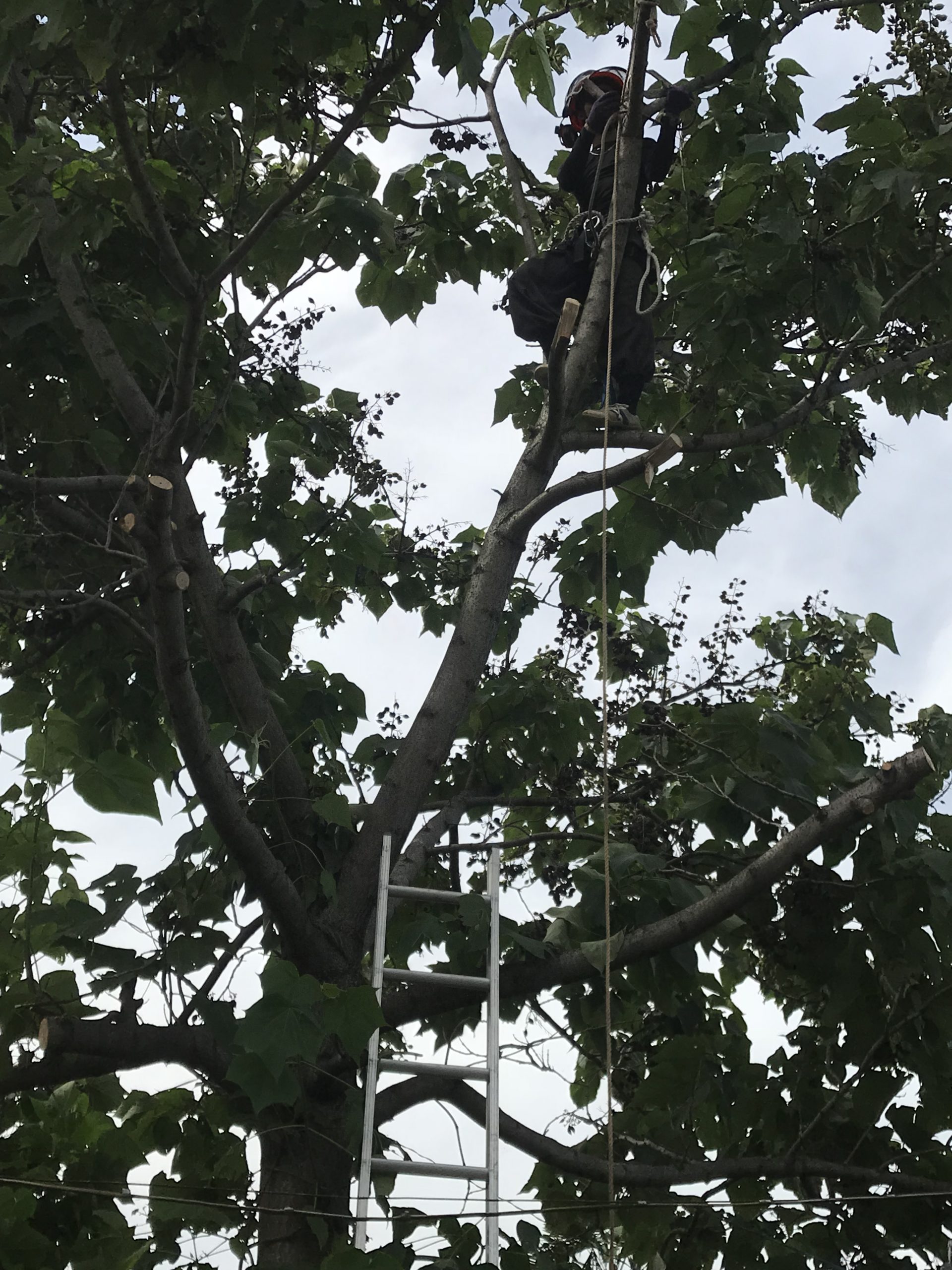 高さ11m程の樹木の伐採を行いました。作業車が入らない場所での伐採作業でしたので、ハシゴで登りロープを使っての吊るし切りで伐採しました。電線なども枝の間を通っているので、線などに注意しながらの伐採作業でした。