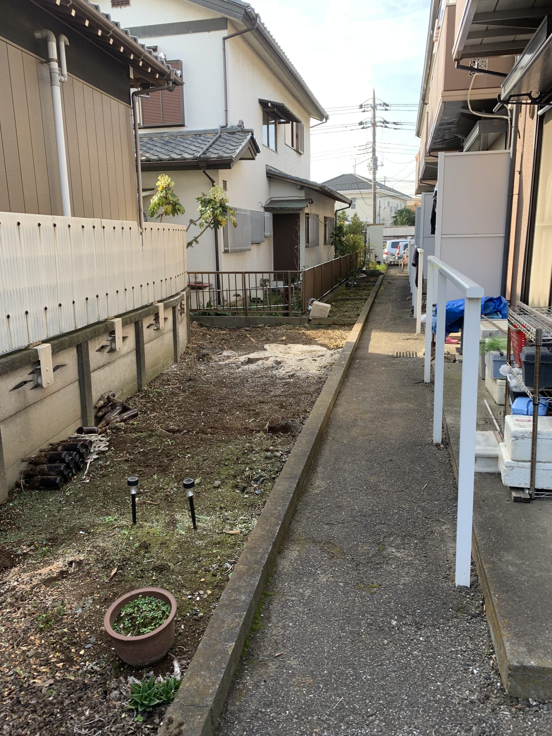 お庭の壁の際に植えていた植木を伐根いたしました。
