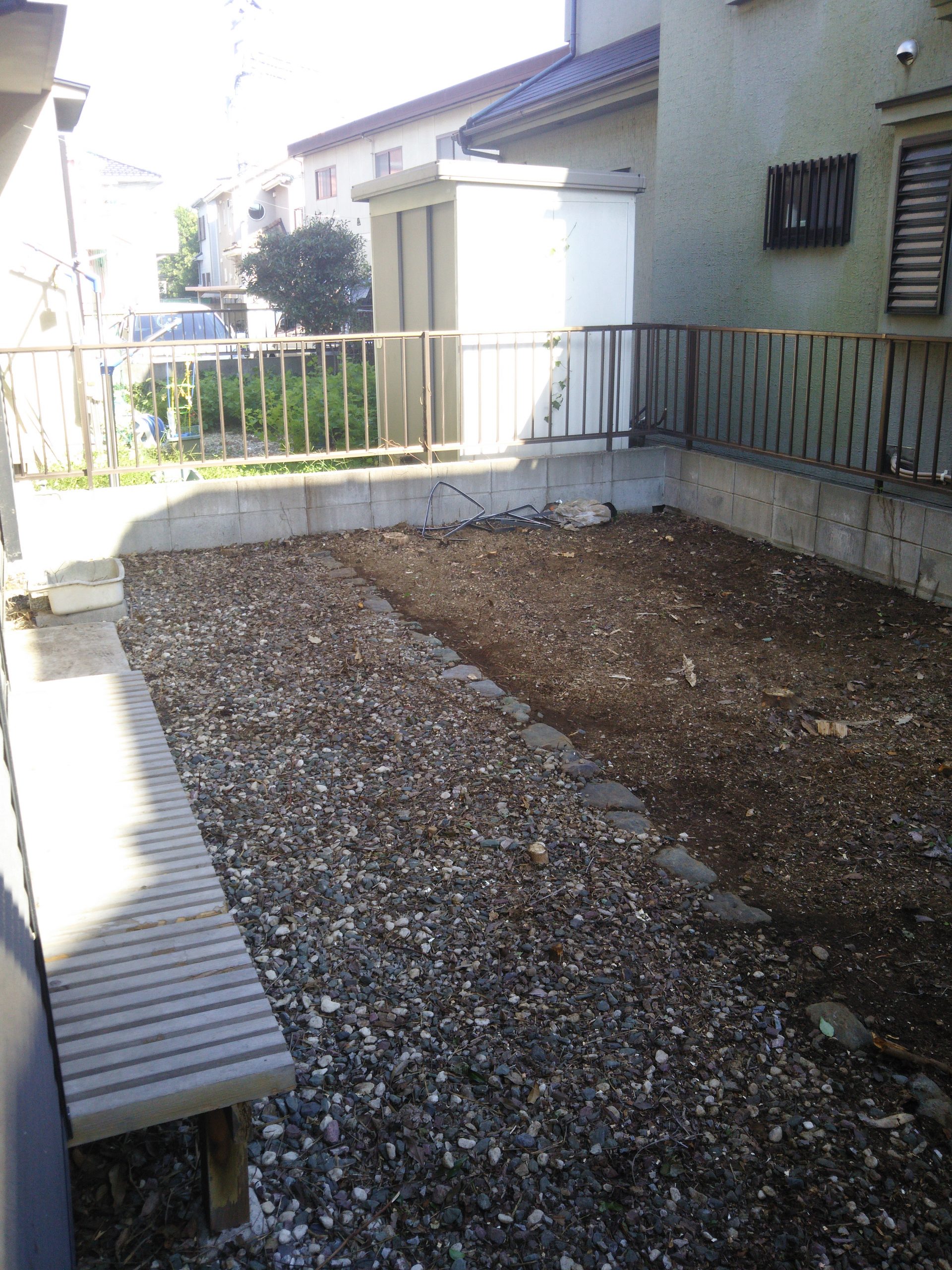 お庭に生い茂った雑草を刈り、整地、敷砂利いたしました。