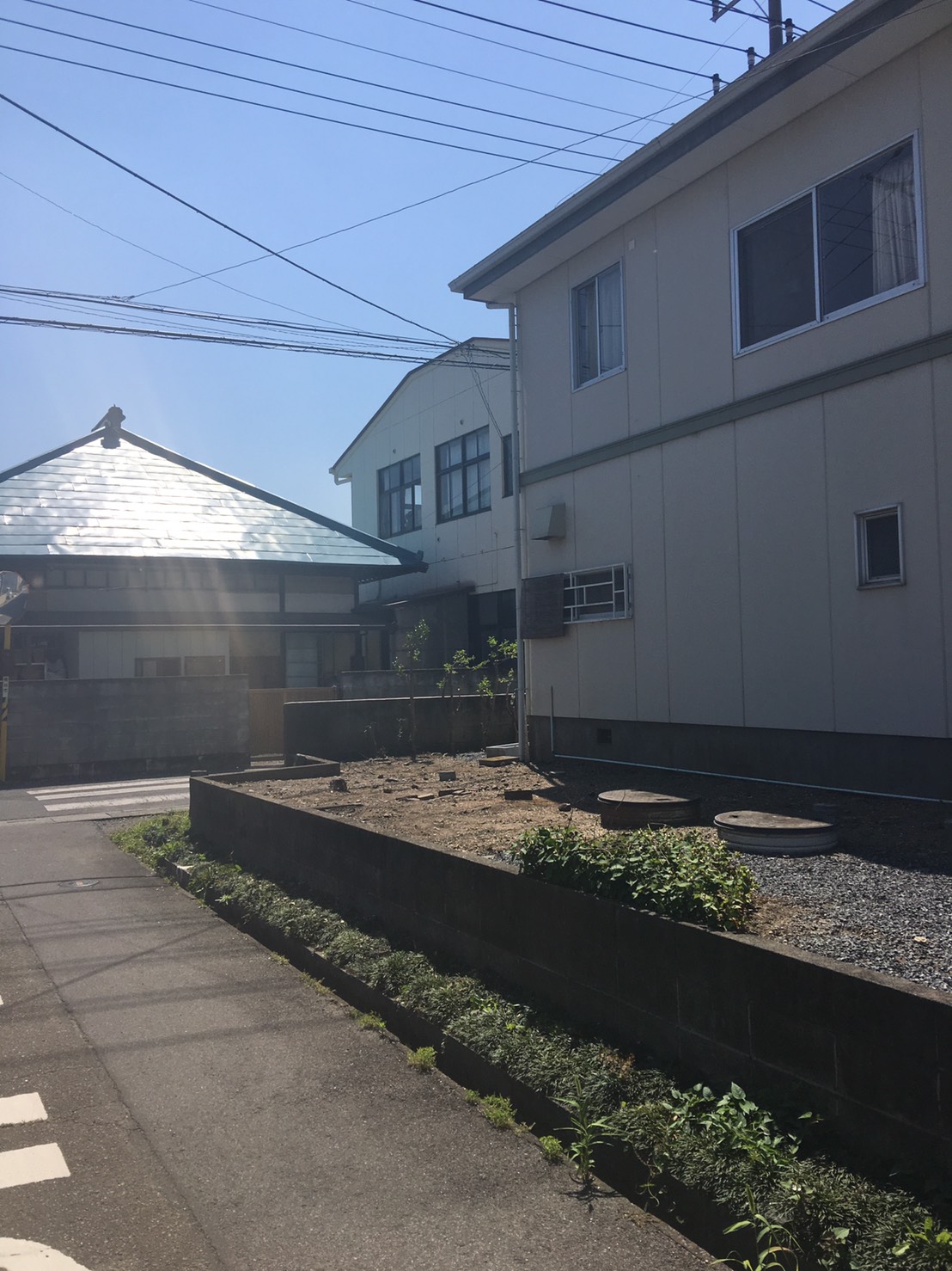 草刈り後に掘削し防草シート、砂利を敷きました。