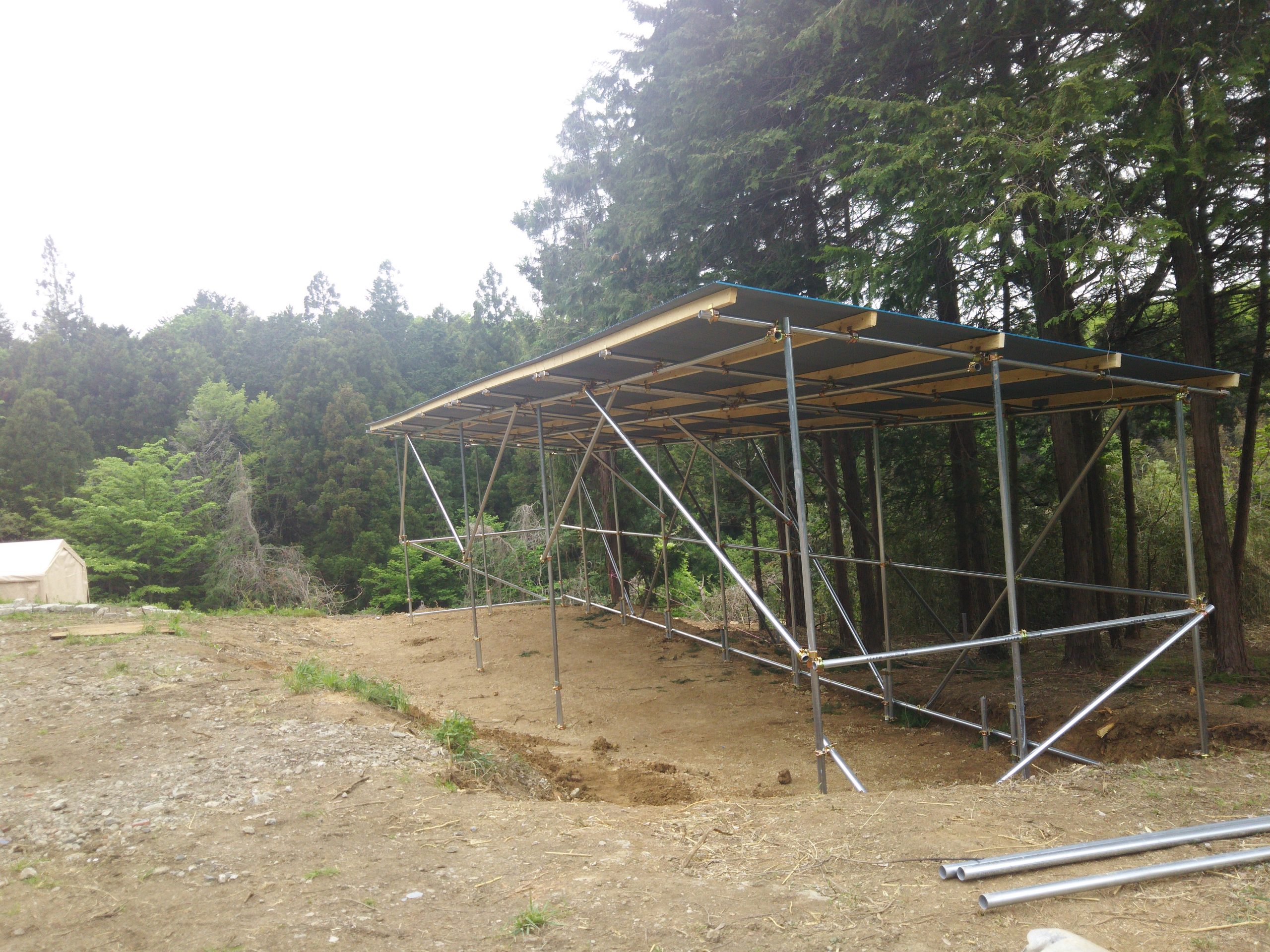 単管パイプを使って長さ15m高さ3mの小屋(ガレージ 物置)を作りました。屋根は波板です。