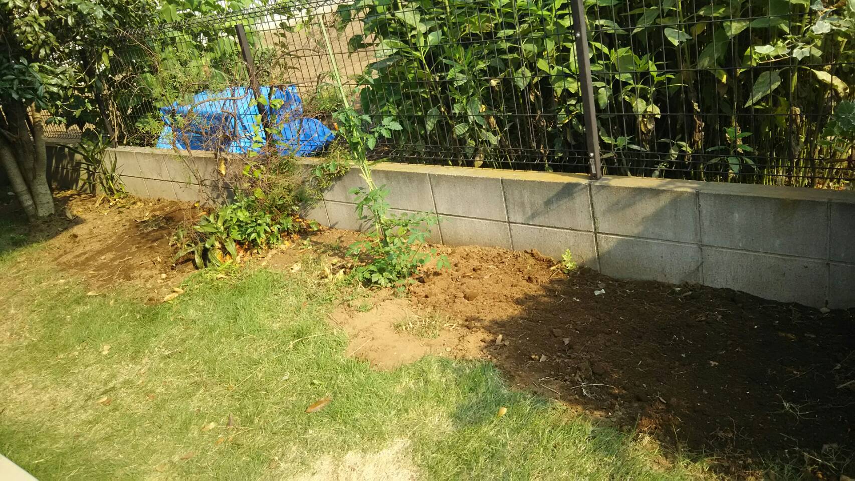 お庭の壁の際に植えていた植木を伐根いたしました。